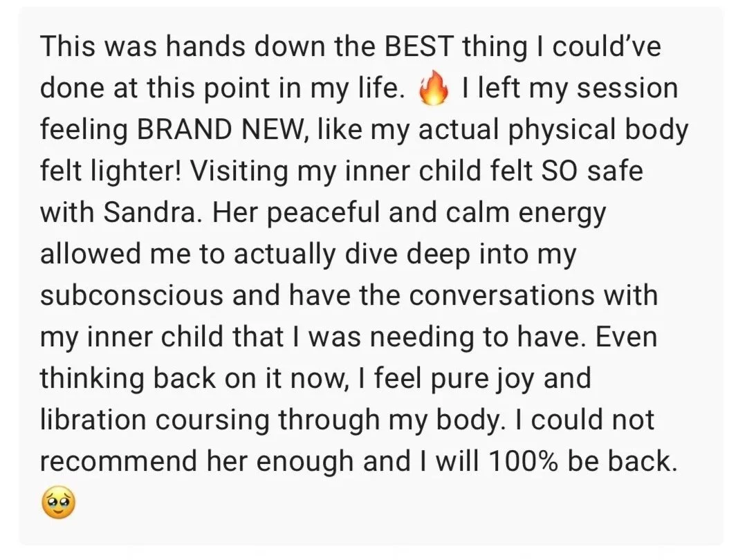 Through a guided meditation facilitated by me, we gently access memories, emotions, and experiences from your childhood that may still be influencing your present patterns. Many of our fears, triggers, relationship dynamics, and self-worth narratives were formed during early developmental years.